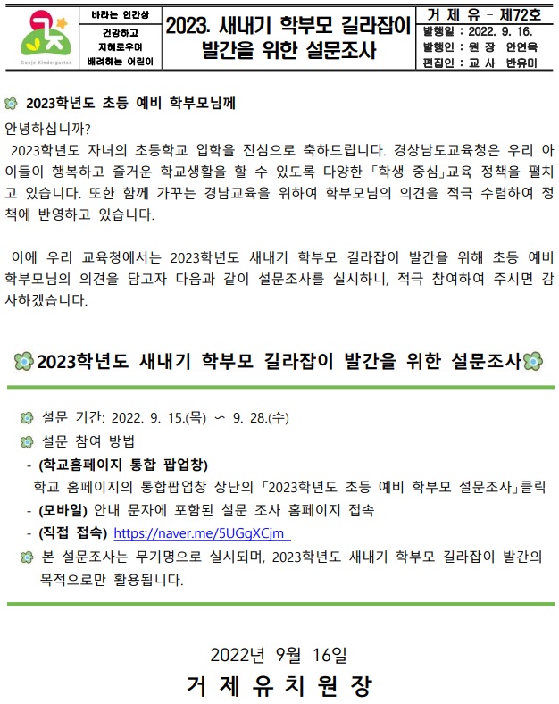 2022. 새내기 학부모 길라잡이 발간을 위한 의견수렴 안내장